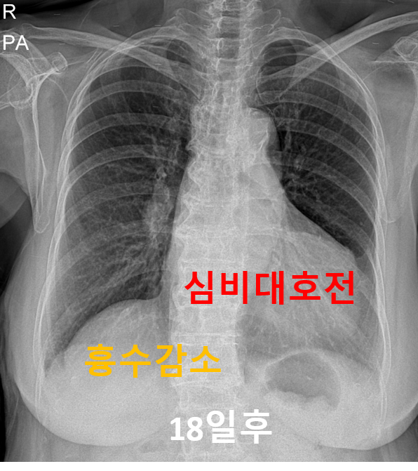 일주일후 엑스레이를 재시행하였더니 양쪽 흉수는 많이 줄어든 상태였으나 심장은 여전히 부어있었습니다.
