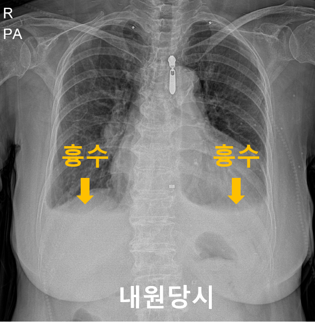 흉부엑스레이를 찍어보았더나 심장비대와 함께 양쪽폐에 흉수가 차있었습니다.